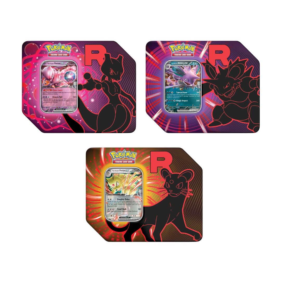 Bring your ambitious plans to fruition by joining forces with some of Team Rocket’s toughest Pokémon! With this tin, choose the strategic mind of Team Rocket’s Mewtwo ex, the potent toxins of Team Rocket’s Nidoking ex, or the prideful power of Team Rocket’s Persian ex as a foil promo card, then discover more Pokémon and Trainer cards inside a handful of booster packs.